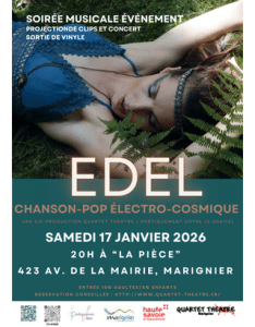 Le samedi 17 janvier à 20h, l’artiste EDEL propose une soirée de sortie musicale à la Pièce, 423 avenue de la Mairie.